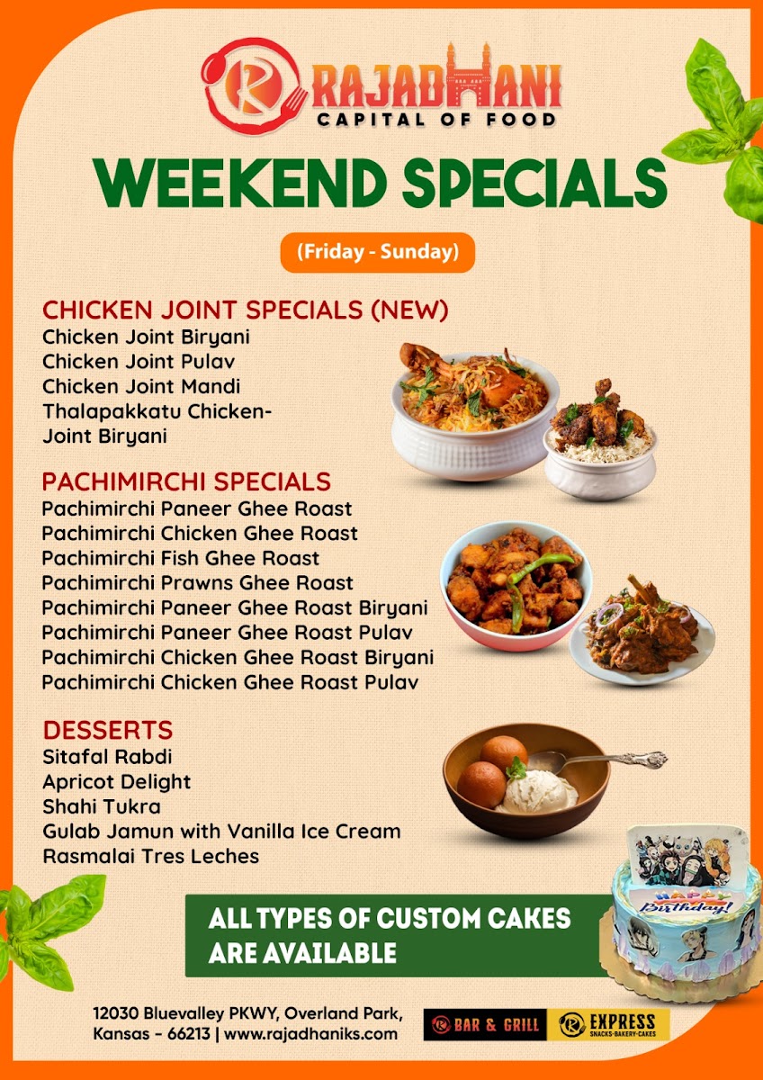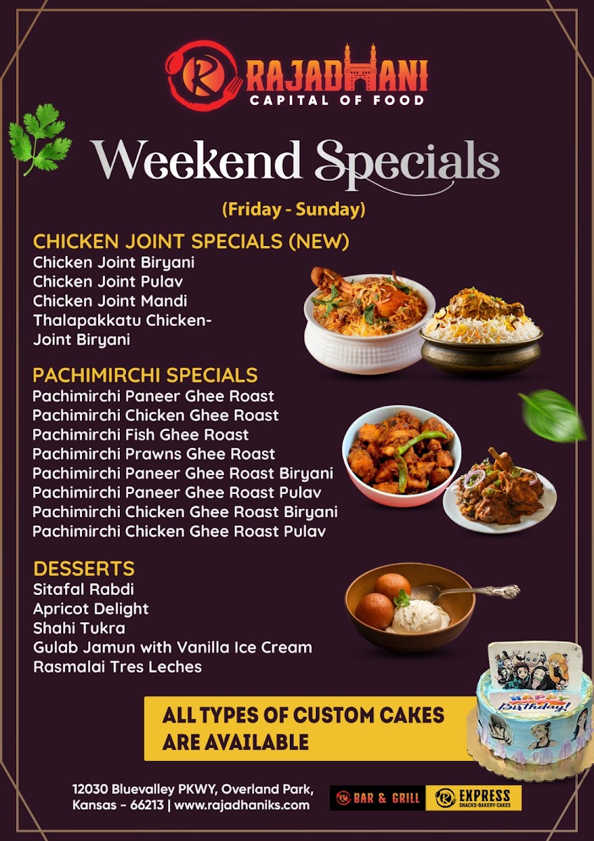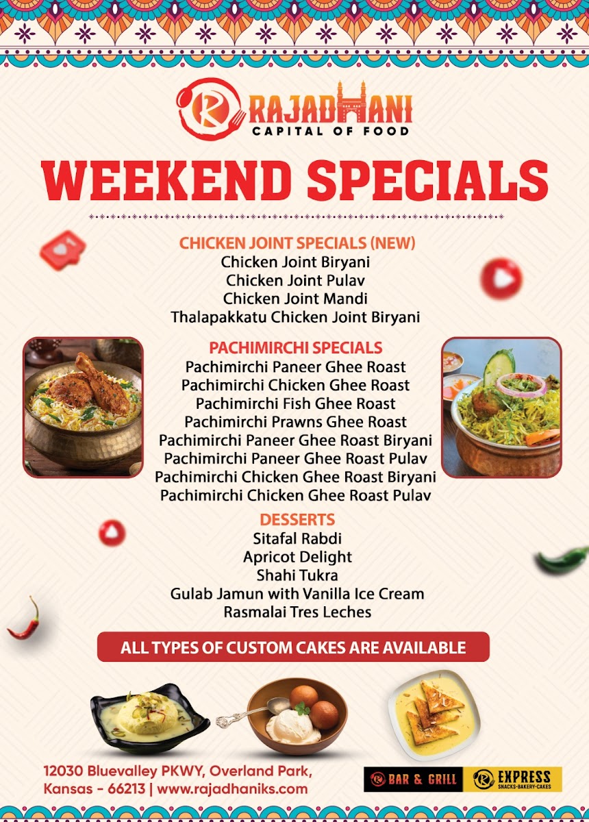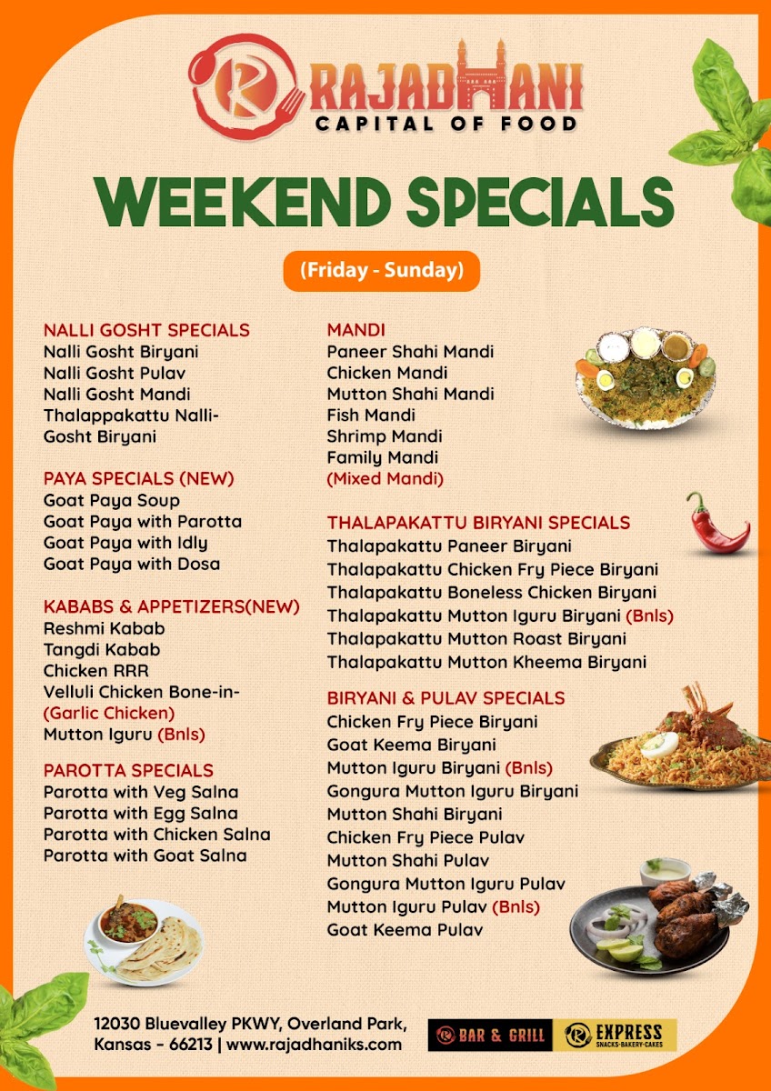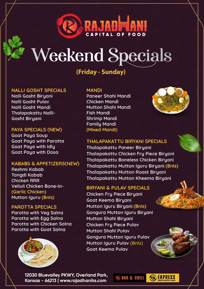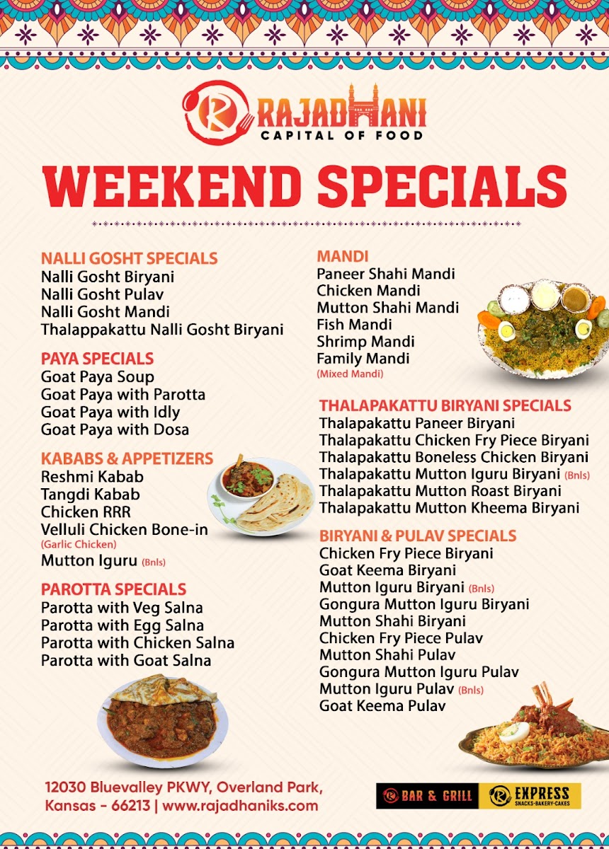 Rajadhani Indian Cuisine, located in Overland Park, KS, offers a vibrant dining experience with authentic Indian flavors. The restaurant has garnered rave reviews for its exceptional service and delectable offerings, including highly praised naan bread, chicken korma, and signature dishes such as keema biryani and chicken chettinad. Guests appreciate the inviting ambiance, perfect for intimate conversations without loud distractions. The attentive staff enhances the experience, ensuring timely service and delightful recommendations. With an outdoor seating area enhancing its charm, Rajadhani is a must-visit for anyone craving quality Indian cuisine in the Kansas City area.